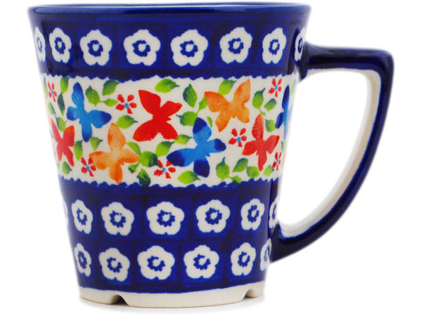 This Polish pottery Mug is made by Zaklady Ceramiczne workshop in Boleslawiec, Poland. Manufacturer item number H4532N. It is 4" high and measures 5¼" by 4". The capacity of this Mug is 13.0 oz when filled to rim and it weighs 1.0 lbs. It is part of the Great Migration Collection.